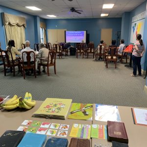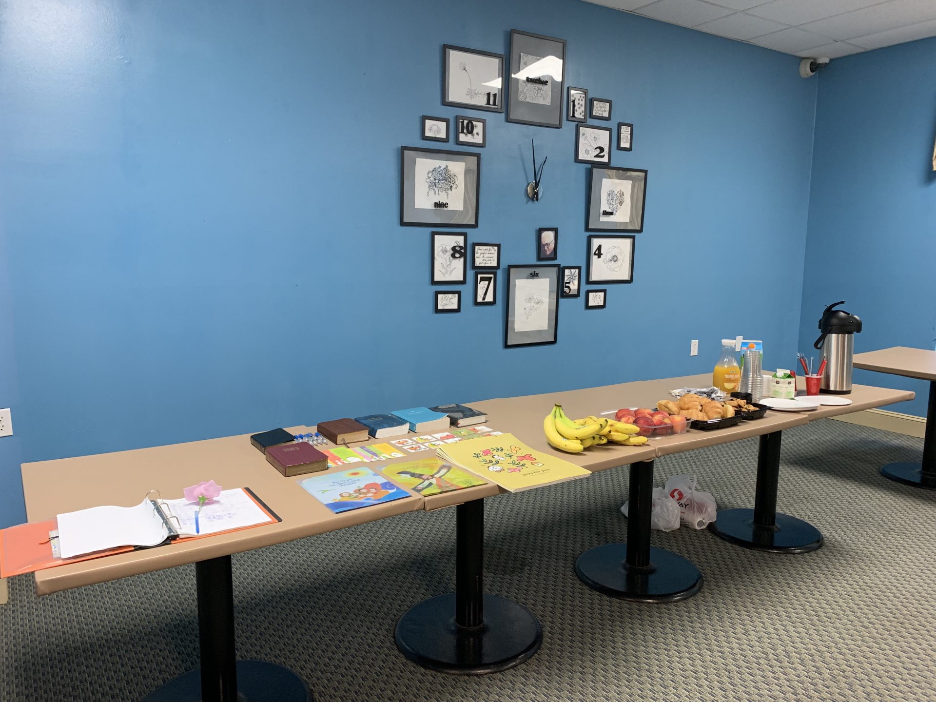 모임이 시작되기 전부터 장소 뒤편에 커피, 주스, 빵, 과일, 소책자 등을 준비합니다. 커피 향기에 이끌려 들어 왔다가 계속 오시는 분도 계실만큼 무척 중요한 역할을 합니다. 오늘은 제가 한국에서 가져 온 볼펜, 달력, 책갈피, 투명 파일홀더, 냉장고용 자석 등을 추가 진열했습니다. 한국적인 캐릭터, 알록달록한 색깔 그리고 영어와 함께 한글이 자리잡은 이 선물들은 무척 특별한 인기를 누렸습니다. 준비한 수량을 모두 사이좋게 나눠 가져 가셨습니다. 그 덕분에 저는 선물의 의미를 설명하기 위해 한 명이라도 더 대화할 수 있어 기뻤습니다.
