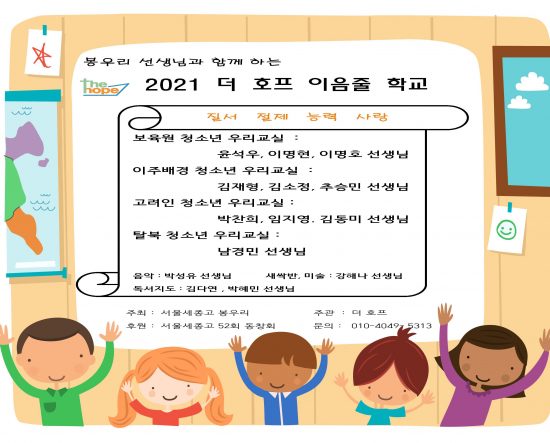 올해 세종고를 졸업한 봉우리 친구들을 중심으로 찾아가는 학교, 이음줄을 새롭게 시작했어요. 이동은 선생님과 세종고 졸업생들의 사랑의 헌신을 통해 교육이 필요한 다문화권 청소년들과 보육원 청소년들을 위한 맞춤 교육이 시작되었습니다. 3월초 이음줄 선생님들께 위촉장을 전달했습니다. 필요한 과목에…